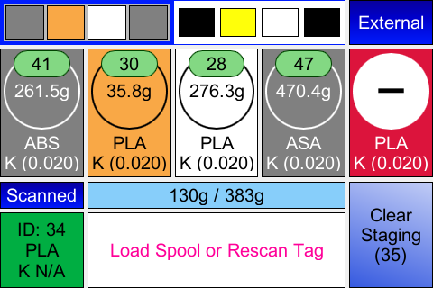 SpoolEase can display the weight of any object (typically a spool) and calculate net filament weight if the spool core weight is known from an NFC tag scan.